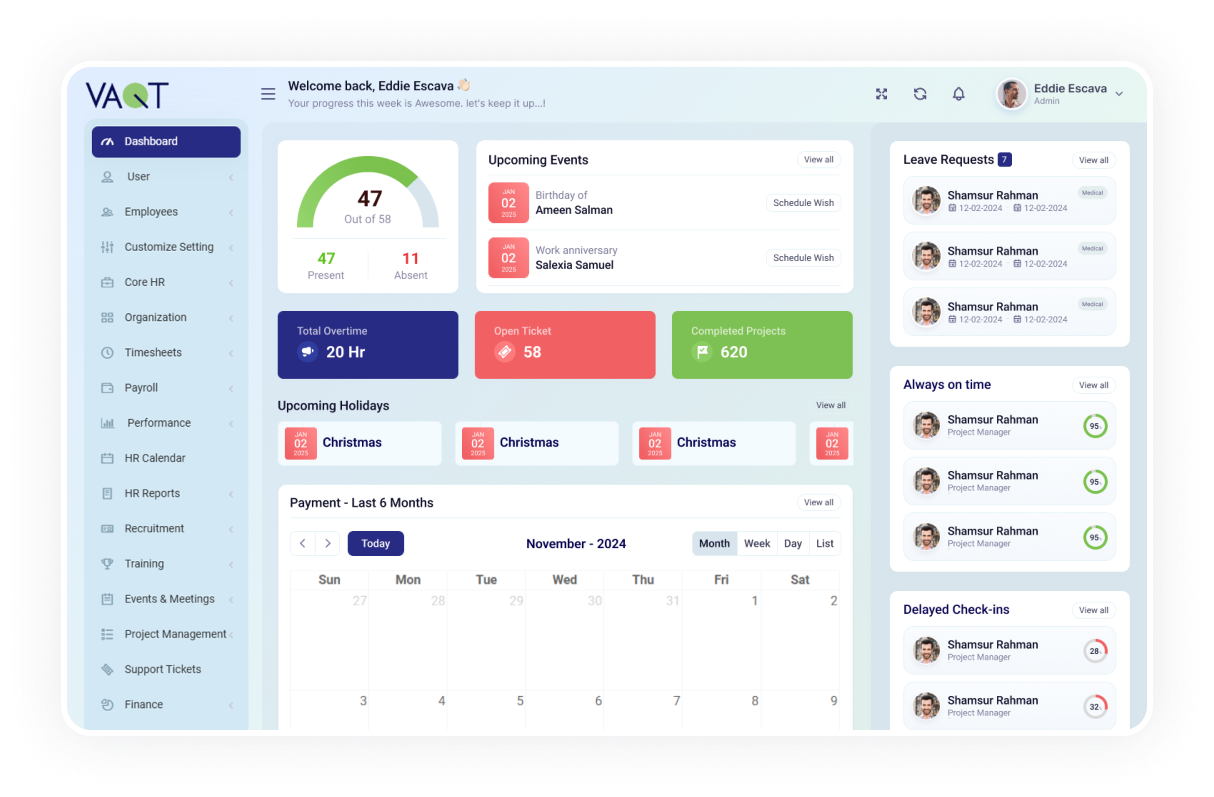 VAQT HRM is a next-generation platform designed to simplify and enhance every aspect of workforce management. With features like attendance tracking, payroll processing, and document management, VAQT ensures efficiency and accuracy. Whether you’re managing in-office staff or a remote workforce, VAQT is tailored to meet your needs